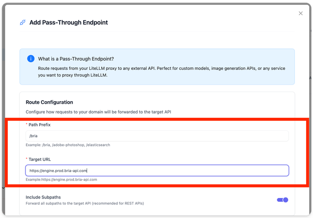 • Path Prefix: The route clients will use when calling LiteLLM Proxy (e.g., /bria, /mistral-ocr)